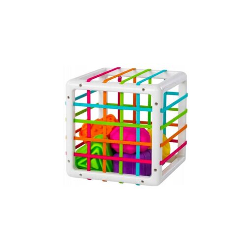 Elastyczna Kostka Sorter Kształtów Fat Brain Toys to innowacyjna zabawka sensoryczna, która rozwija zdolności motoryczne, koordynację ręka-oko oraz logiczne myślenie dziecka. Dzięki elastycznym, miękkim ściankom z kolorowych gumek maluch może badać kształty i faktury, wkładając i wyciągając elementy przez otwory w kostce.